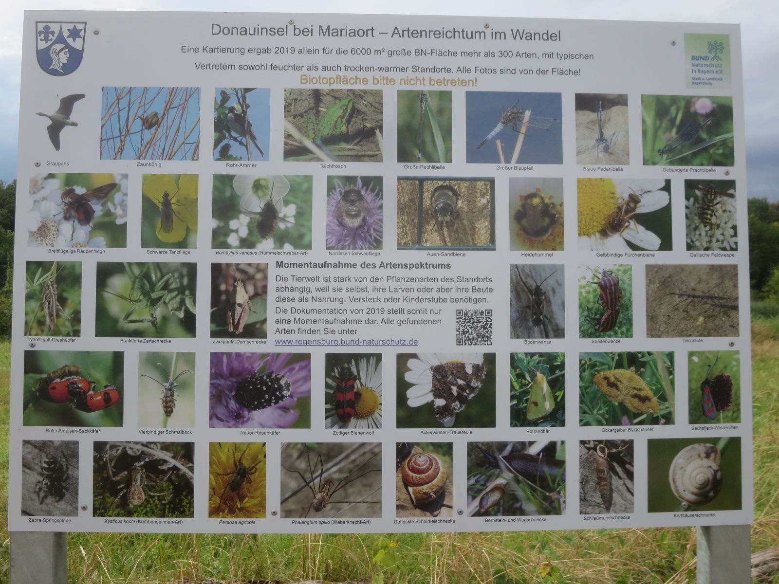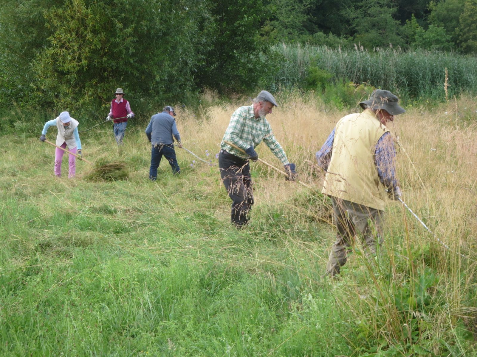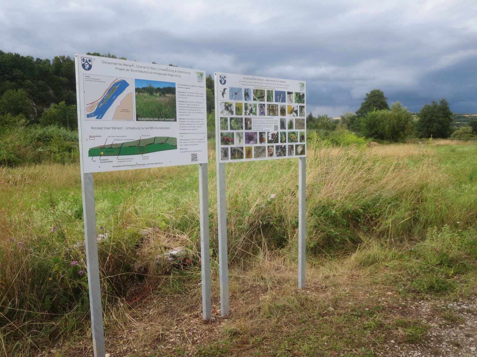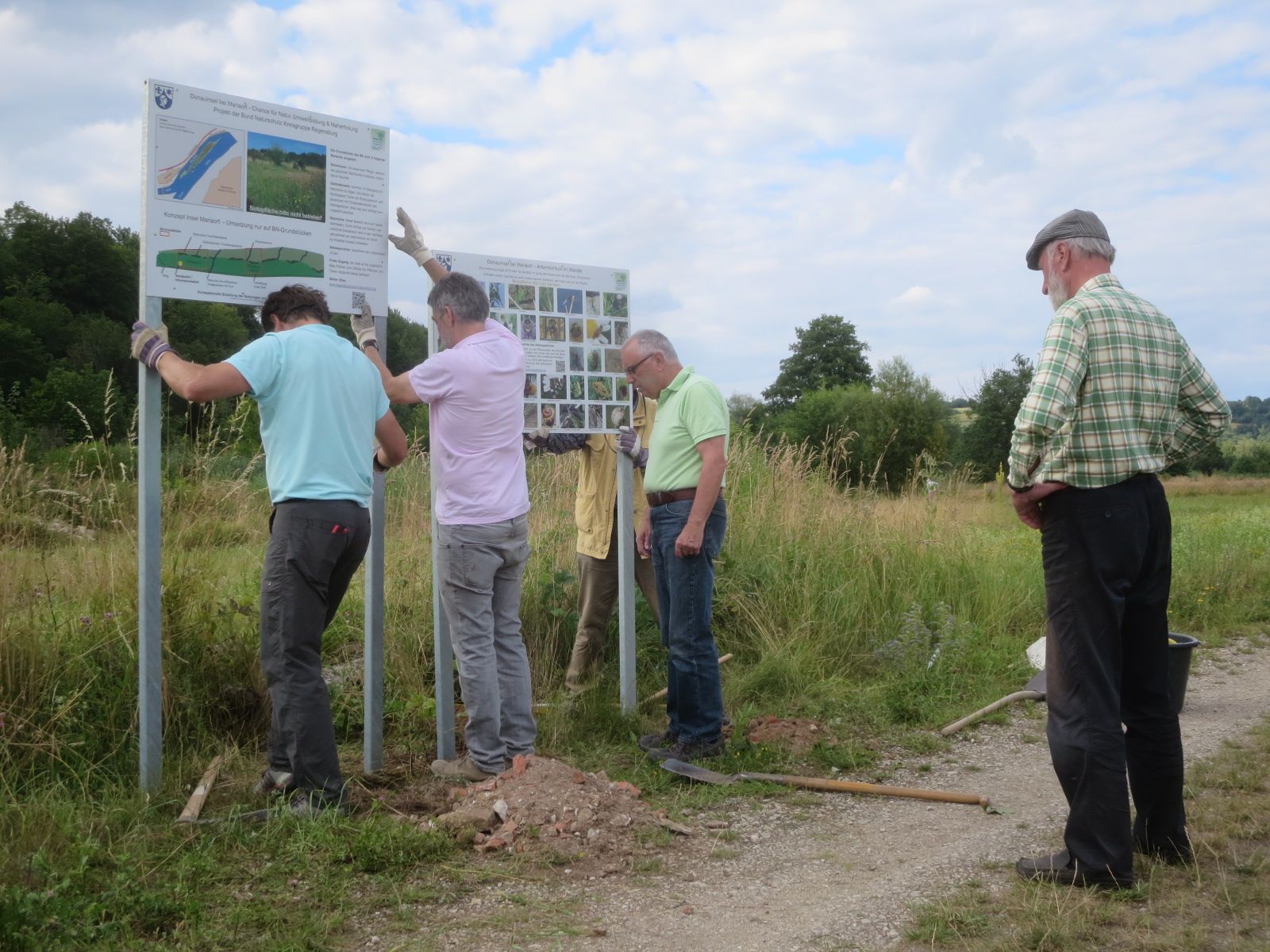 Zwei neue Tafeln, die BN-Mitglieder Mitte Juli aufstellten, sollen Spaziergänger und Angler über die Biodiversität der neuen naturnahem Flächen und die weiteren Vorhaben des BN informieren. Die Fotos zeigen elf BN-Mitglieder, die sich am 17. Juli getroffen hatten, um immer wiederkehrende Pflegearbeiten durchzuführen. Einige Mitglieder stellten die neuen Schilder auf und andere mähten wie jedes Jahr die schon vor einigen Jahren angelegten Blühwiesen.