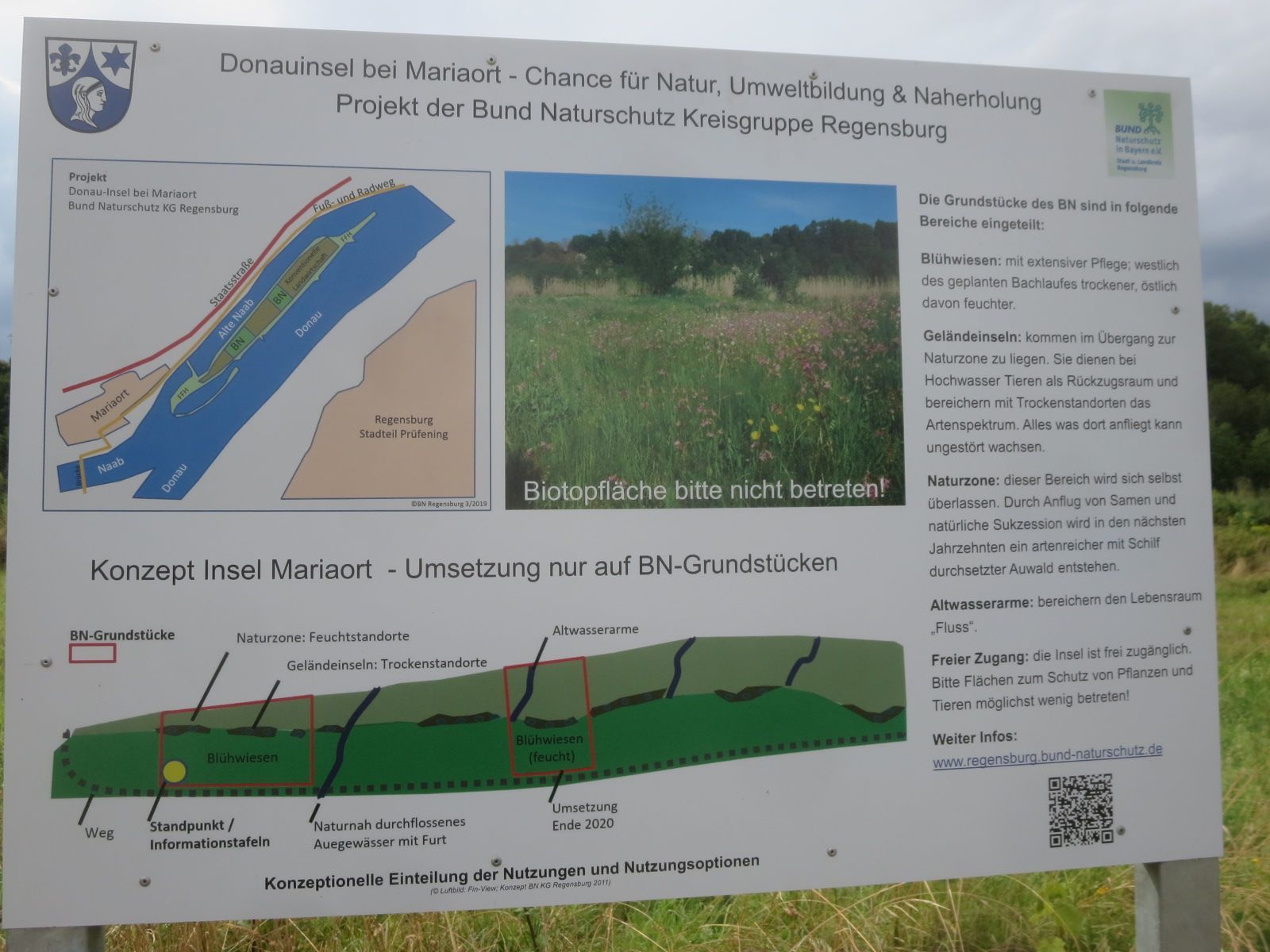 Im Eigentum des BN sind zurzeit etwa ein Hektar: über 10.000 Quadratmeter. Über 4.000 Quatratmeter hat die Kreisgruppe kürzlich dazugekauft. Sie werden ab September 2020 renaturiert. Die anderen 6.000 sind inzwischen eine artenreiche Wiesenlandschaft und ein vorzüglicher Treffpunkt der Insekten und Vögel. Einige Uferbereiche wurden modelliert und werden schon bei kleinen Hochwässern überschwemmt und bieten wasserliebenden Tieren, zum Beispiel dem Eisvogel, sowie Pflanzen einen neuen Lebensraum. Die restlichen 4.400 Quadratmeter werden noch landwirtschaftlich genutzt, kommen ab 2021 dazu und dürfen nach einem Bescheid des Landsamtes so gestaltet werden, dass bereits bei geringen Hochwasser Teile überschwemmt werden und die typische Auenlandschaft entstehen kann.