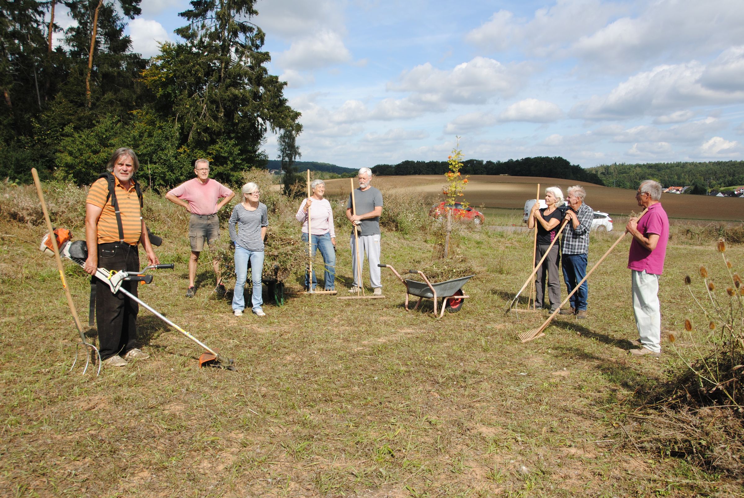 Das ist bei uns ein Dauerbrenner. Wie auch in Vorjahren pflegten wir auch in 2025 einige ökologisch wertvolle Flächen. Das geschah in Gemeinschaftsarbeit und in durchaus auch immer gesellschaftlich angenehmer Atmosphäre. Die Arbeit bestand im Mähen, Zusammenrechen und Abtransportieren von Mähgut. Dabei kommen Balkenmäher und Elektrosensen zum Einsatz und keine „Häckselmäher“, und nach dem Mähen kommt der klassische Handrechen zum Einsatz. Die Ortsgruppe konnte dadurch über die Jahre nachweislich die Ansiedelung von Arten fördern. Die bearbeiteten Gebiete sind das Fruticetum bei Neudorf, die Ausgleichsfläche bei Rohrdorf, der Schafbuckel bei Dettenhofen und die Diptamwiesen über Pielenhofen.